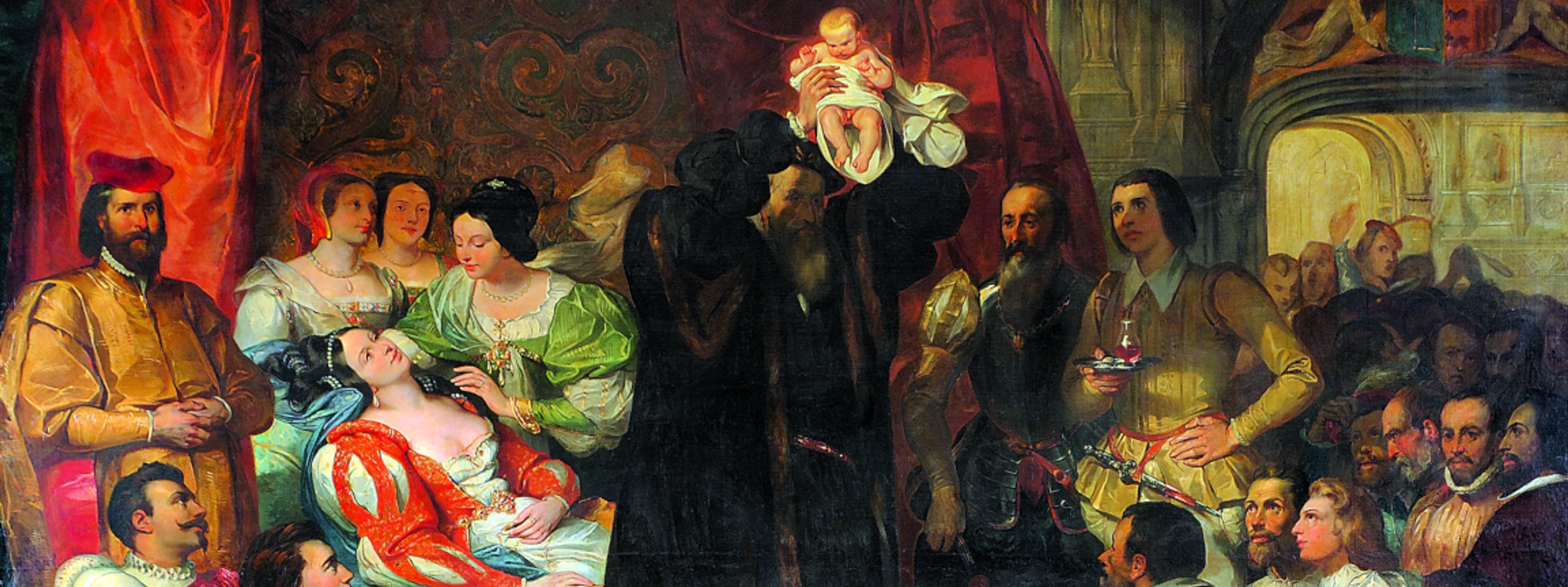 La composition pyramidale met l'accent sur le nouveau-né présenté à la foule par son grand-père, Henri d’Albret.