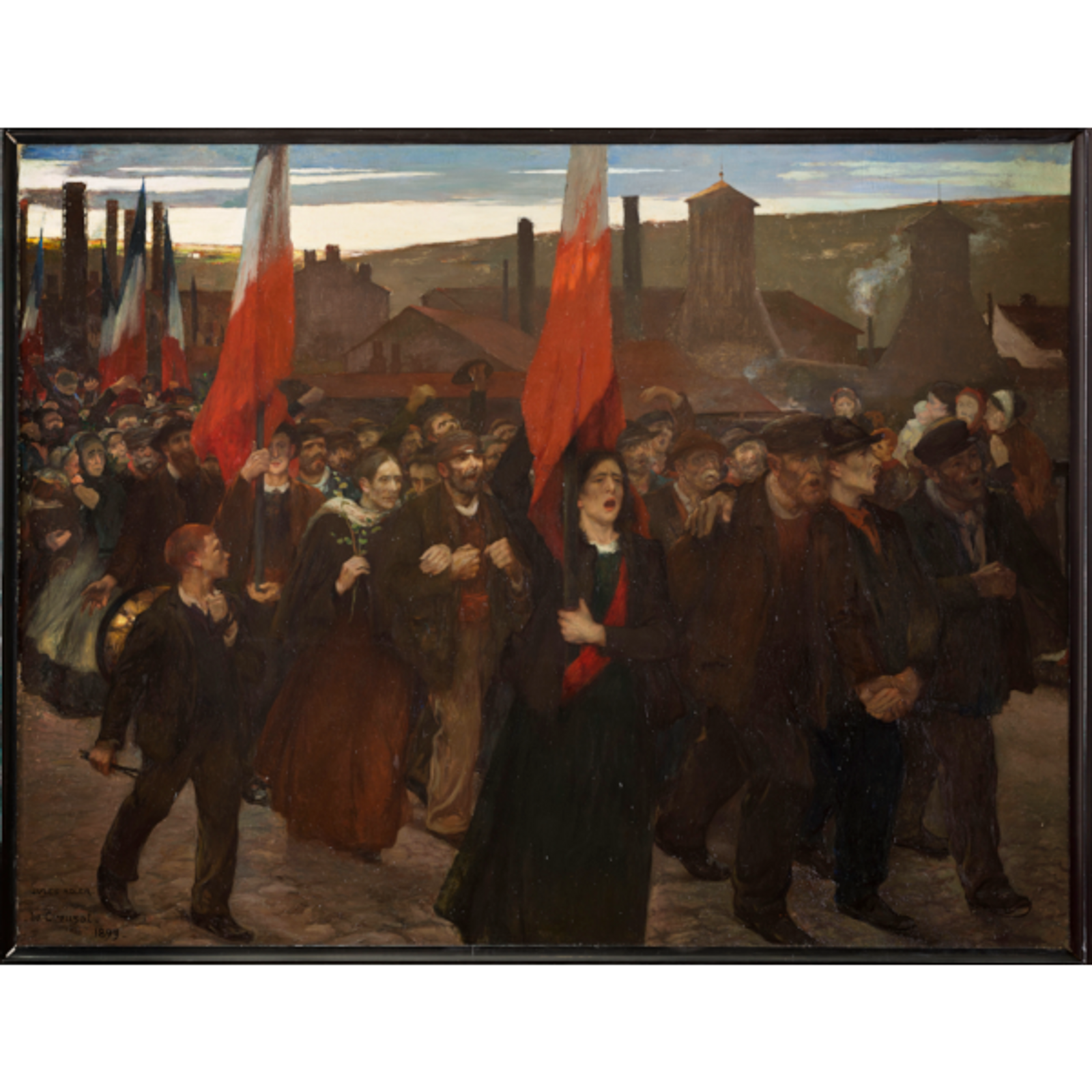 La peinture du musée des beaux-arts de Pau représente un cortège d’ouvriers lors de la célèbre journée de grève du 24 septembre 1899 au Creusot, en Bourgogne.