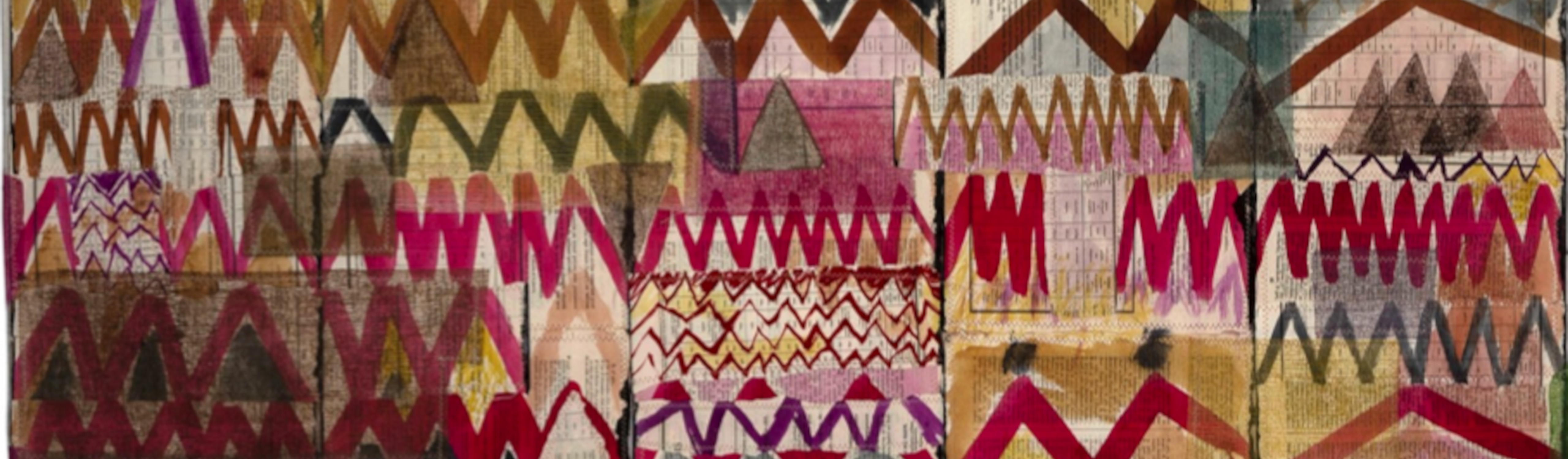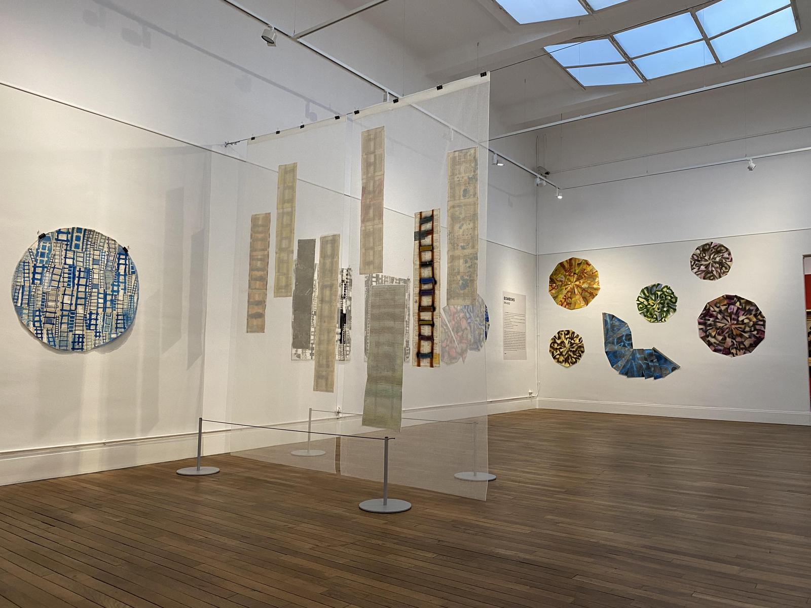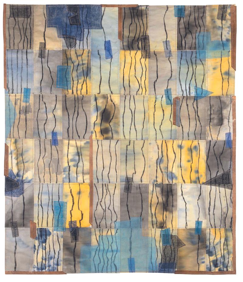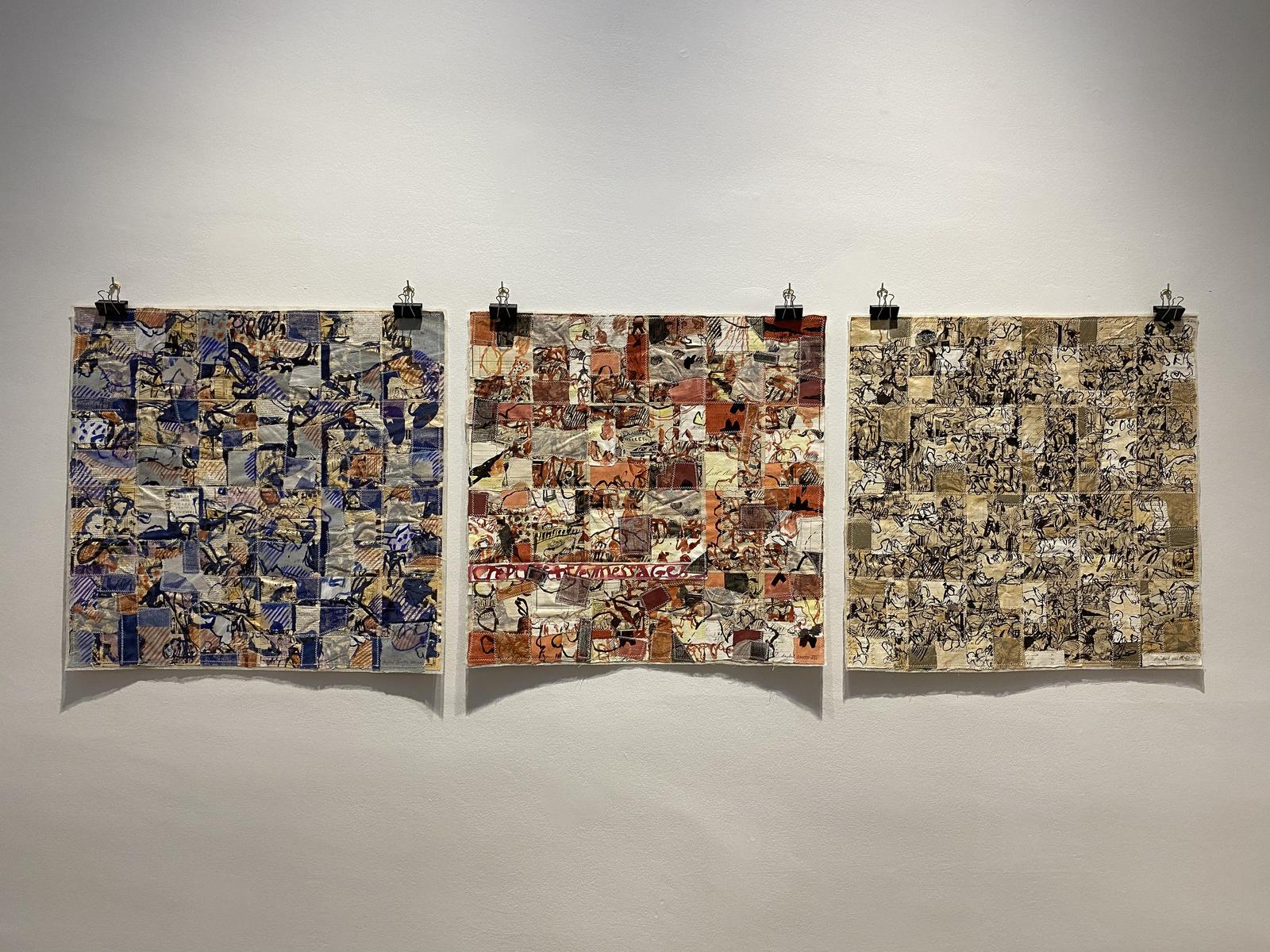 Michel Danton travaille à partir de matériaux graphiques qu’il collecte, chine. Il dessine, peint sur ces papiers puis les coud sur un tissu très léger appelé tarlatane, qui donne à l’ensemble une matérialité particulière.