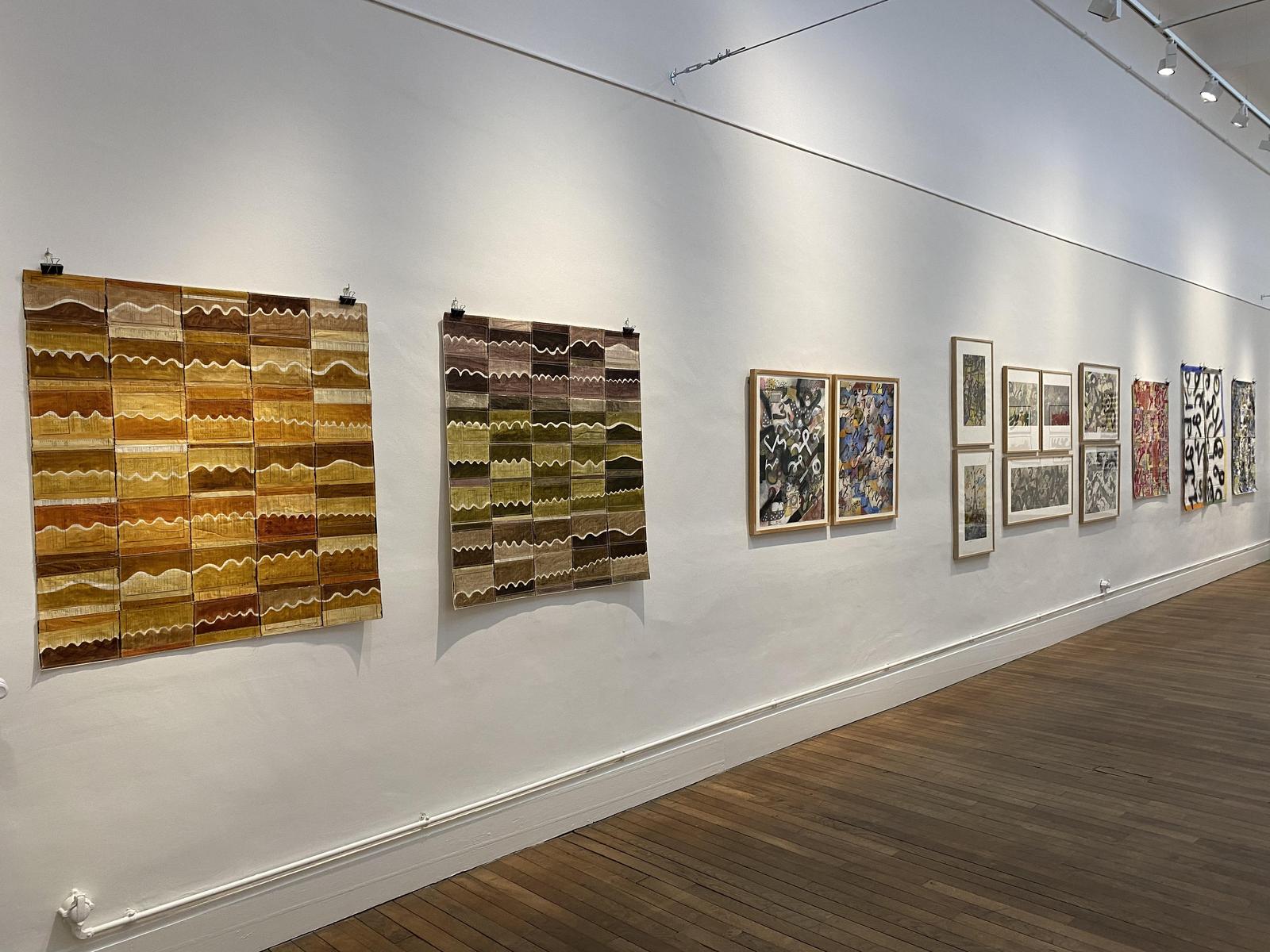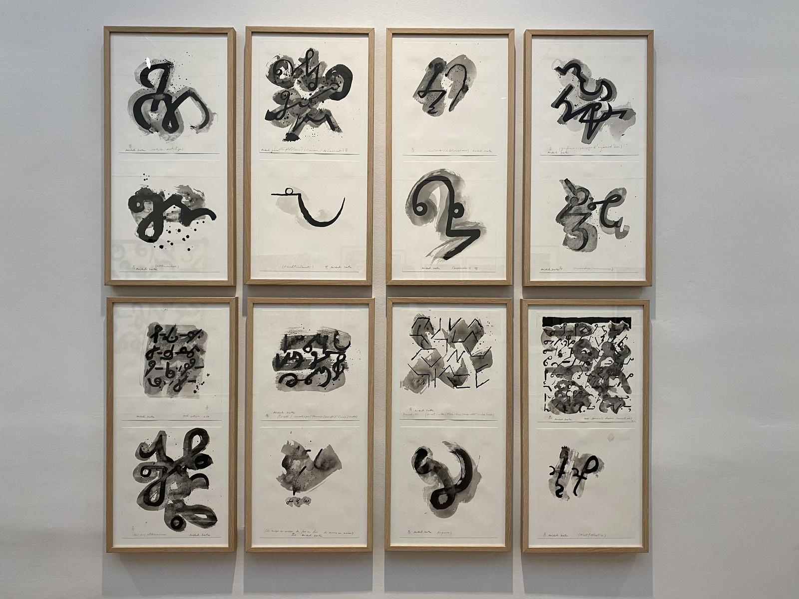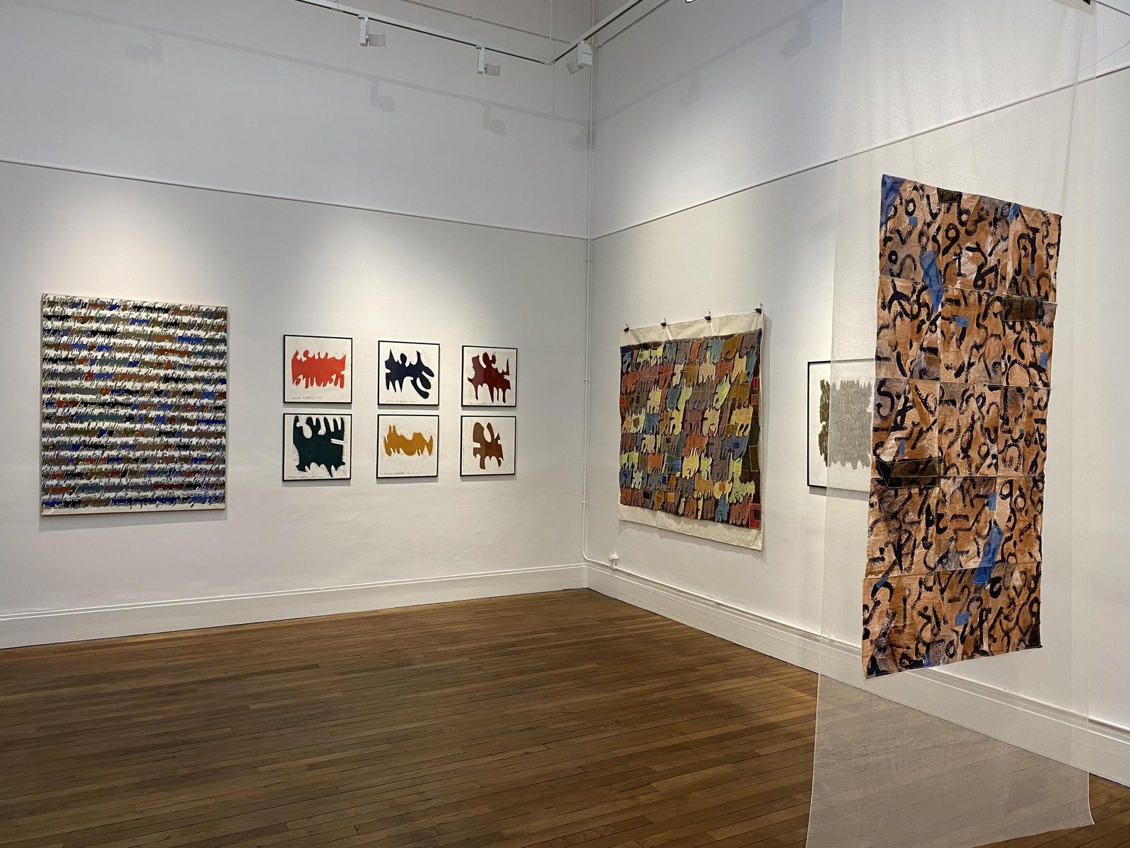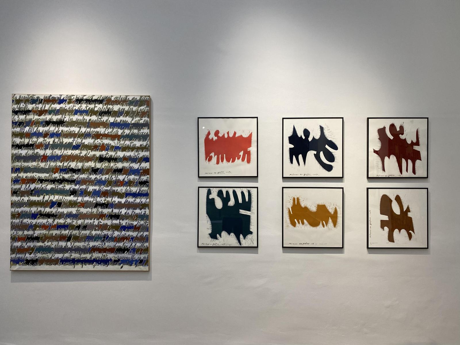 Inspiré par les multiples alphabets, la calligraphie, mais aussi la sténographie, l’artiste réalise des compositions où lettres et signes s’entrelacent et créent un mouvement. La disposition de ces signes, mais aussi l’alternance des pleins et des vides produisent un rythme subtil qui confère à l’ensemble une certaine musicalité. Par ailleurs, l’élégante harmonie des teintes démontre l’indéniable talent de coloriste de l’artiste.