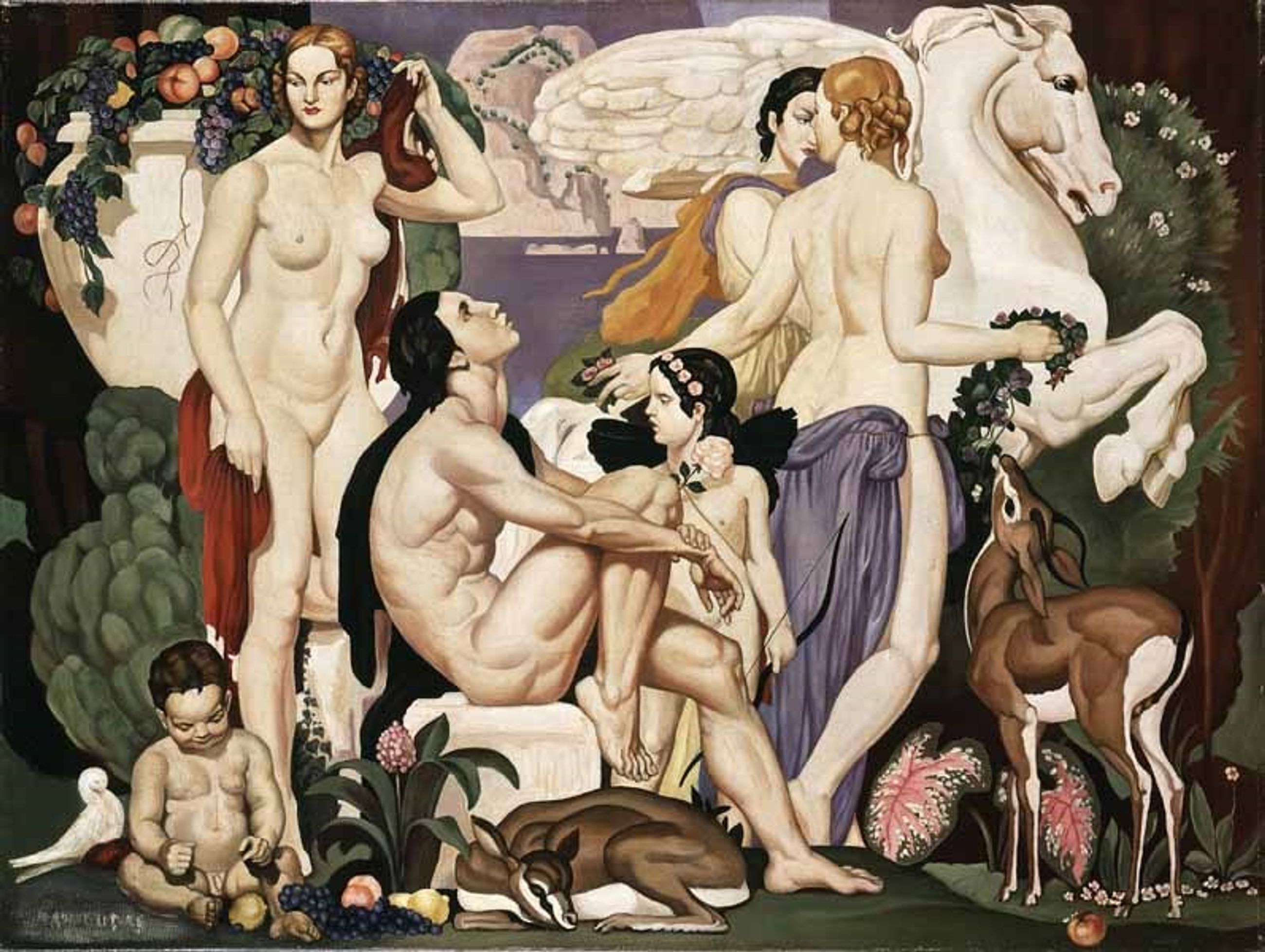 - Notice biographiqueCet artiste, passé par l'atelier de Gérôme puis de Carolus Duran, remporte le grand prix de Rome en 1907 en exposant Virgile composant les Georgiques. De 1905 à 1937, il expose avec régularité, au Salon des Artistes Français, d'ambitieuses compositions mythologiques ou religieuses mais aussi des portraits et des pastorales. Son style, aisément reconnaissable, affectionne les formes pleines insérées dans des paysages aux colorations souvent oniriques. Son art, puisant volontiers aux sources de célèbres créations bellifontaines, rejoint l'inspiration d'un Dupas ou d'un Poughéon et, par son étrangeté, apporte une contribution essentielle au mouvement Art Déco.